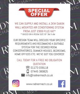 We currently have a promotion for domestic air conditioning! Is your house too hot in the summer and costing too much to heat in the winter? We can supply and install a 2kW Daikin air conditioning systems which will heat and cool a room to your desired temperature for just £999 plus vat.*